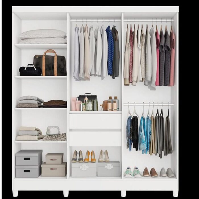Sua pintura em ultravioleta com acabamento semi-brilho proporciona um visual moderno e elegante, ideal para qualquer ambiente. Com quatro portas de abrir, equipadas com dobradiças metálicas e corrediças telescópicas, o acesso ao interior é facilitado, permitindo organizar suas roupas de forma prática.
